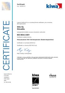 Tasan vuosi sitten Orfer Valmistuspalvelut saavutti tärkeän virstanpylvään; meille myönnettiin ensimmäistä kertaa SFS-EN ISO 3834-2 -hitsaustuotannon laatusertifikaatti. Nyt onkin aika juhlistaa sertifikaatin ensimmäistä vuosipäivää ja todeta, että kehitys on ollut tavoitteiden mukaista.